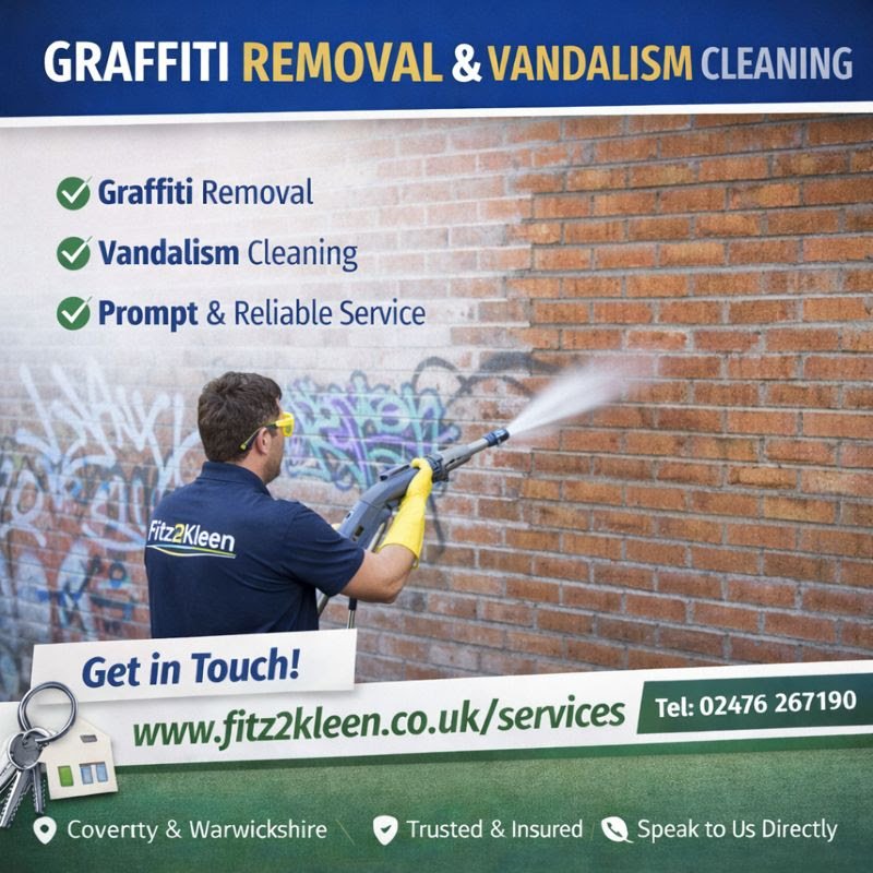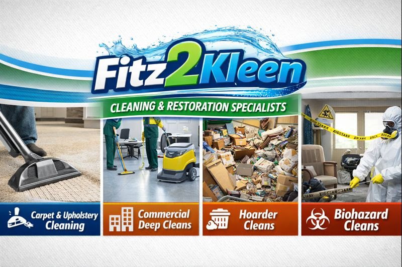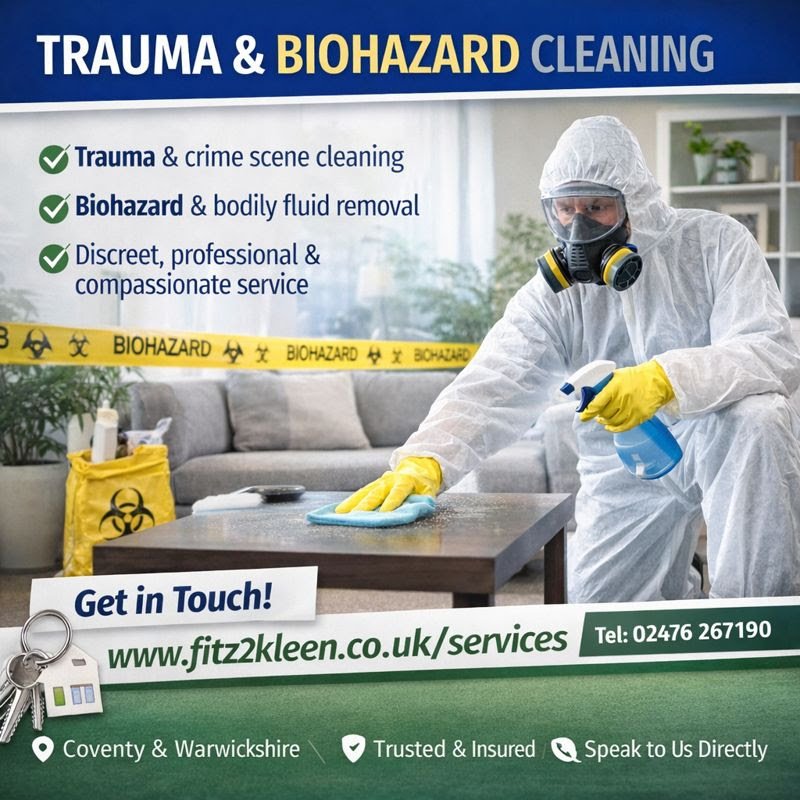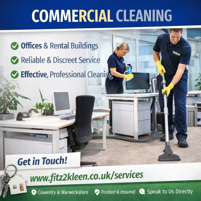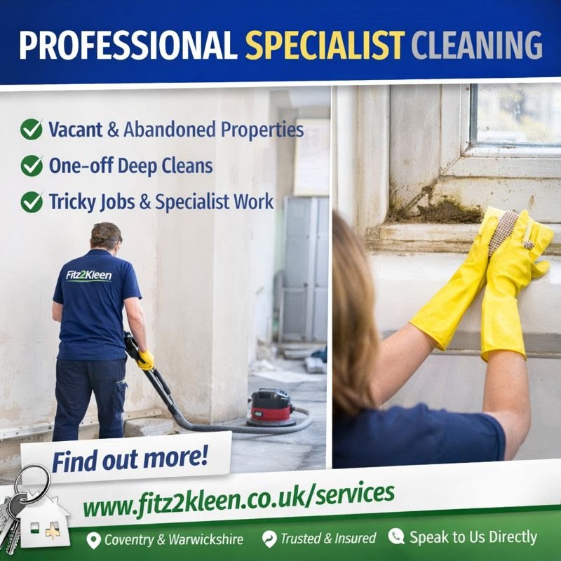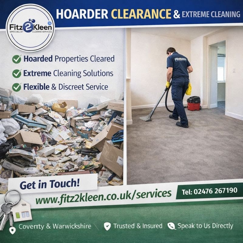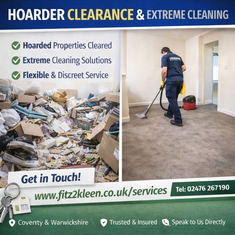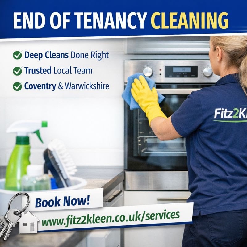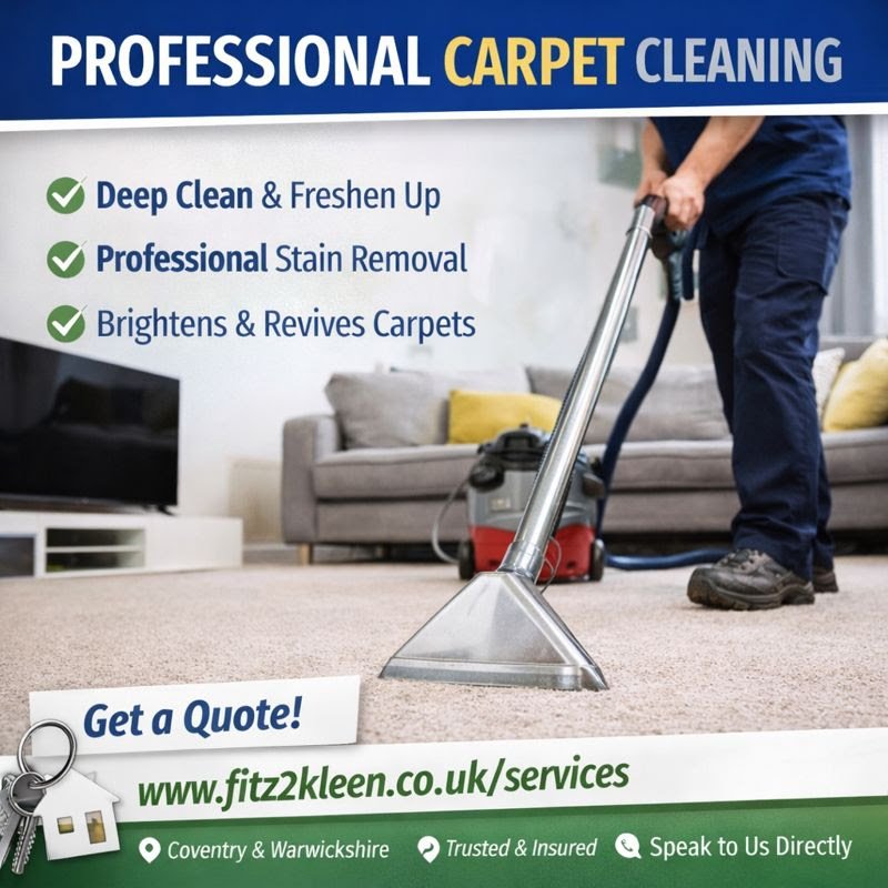 Fitz2Kleen is a professional cleaning company based in Coventry, proudly serving homes and businesses across Coventry, Warwickshire, Nuneaton, Bedworth, Kenilworth, Leamington Spa, Rugby, and surrounding areas. We specialise in carpet and upholstery cleaning, end of tenancy cleans, fire and flood restoration, hoarder and extreme cleaning, and a full range of domestic and commercial cleaning services. Our team delivers reliable, high-quality cleaning with a friendly and professional approach. Whether you need a one-off deep clean or specialist support for a sensitive situation, we’re here to help create a clean, safe and healthy environment. Contact us via WhatsApp, email or our website to book a service or request a quote.